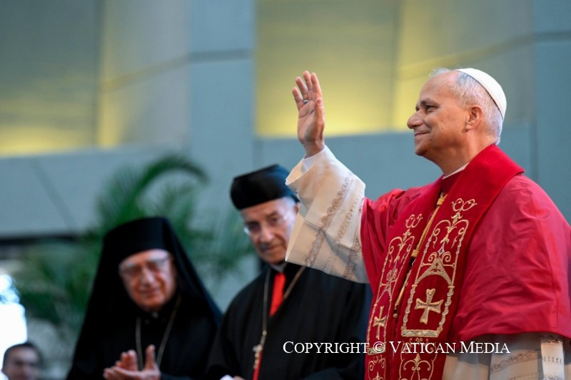 Nagy örömmel találkozom veletek ennek az apostoli látogatásnak a keretében, amelynek mottója: „Boldogok a békességszerzők” (Mt 5,9). A sokszínűségében is egységes libanoni egyház e szavaknak az ikonja, ahogy azt Szent II. János Pál mondta, aki nagyon szerette népeteket: „A mai Libanonban – mondta – a remény felelősei vagytok” (Üzenet Libanon lakosainak, 1984. május 1.); és hozzátette: „Teremtsetek testvéri légkört ott, ahol éltek és dolgoztok. Ne legyetek naivak, mégis adjatok bizalmat másoknak, és legyetek kreatívak, hogy győzelemre juttassátok a megbocsátás és az irgalom újjáteremtő erejét” (uo.).