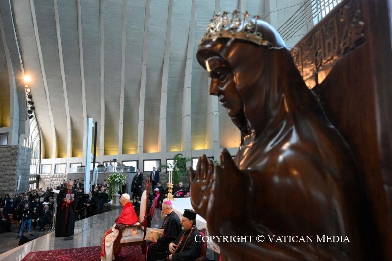 A pátriárka szavaiban – akinek szívből köszönetet mondok – felfedezhetjük ennek az elszánt állhatatosságnak a gyökerét. Ezt az állhatatosságot jelképezi a csendes barlang, ahol Szent Charbel az Istenanya képe előtt imádkozott, és ennek a harissai kegyhelynek a jelenléte, mely az egész libanoni nép egységének a jele. Mária mellett állva Jézus keresztjénél (vö. Jn 19,25) imádságunk – ez a szíveket összekötő láthatatlan híd – erőt ad ahhoz, hogy reménykedjünk és dolgozzunk, akkor is, amikor fegyverek ropogását halljuk magunk körül, és a mindennapi élet követelményei is kihívássá válnak.