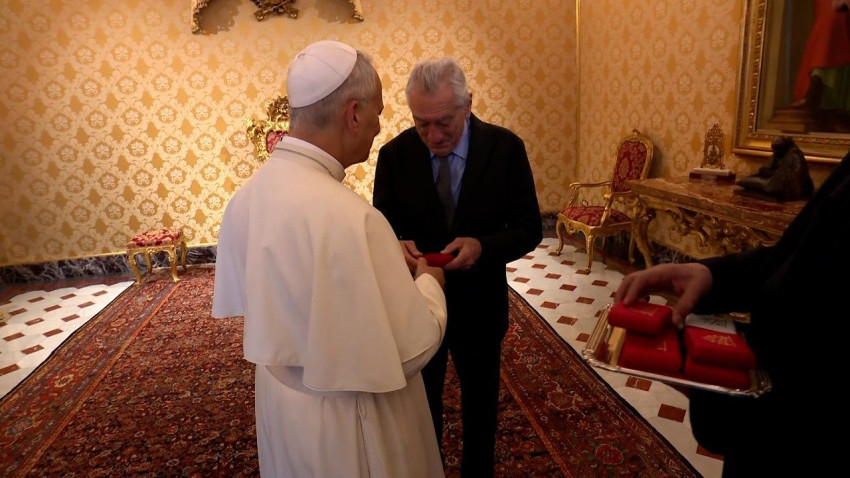 Először nevetés hallatszott – olyan nevetés, ami akkor tör elő, amikor szemtől szembe találod magad valakivel, akinek az arcát már számtalanszor láttad a képernyőn és a magazinokban, és most ott áll előtted. Aztán jött az üdvözlés – a pápa szólalt meg elsőként: „Jó reggelt! Örülök, hogy találkozhatok Önnel!” „Én is” – válaszolta Robert De Niro.