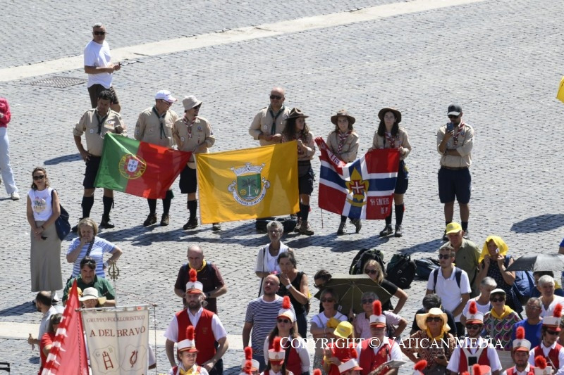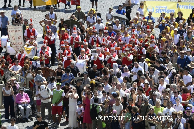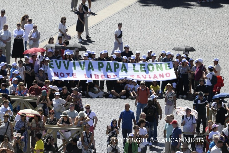 Köszöntöm továbbá a padovai Dimesse Nővérek világi testvériségét, a Katolikus Akció és a Reggio Calabria-i AGESCI fiataljait, a Gorla Maggiore-i fiatalokat és a Castel San Pietro Terme-i bérmálkozókat; valamint a San Miniato-i Shalom Mozgalmat az Angiolo del Bravo filharmonikusokkal, a tavianói „Note libere” Egyesületet és az „Orsenigo Szülők” csoportot.